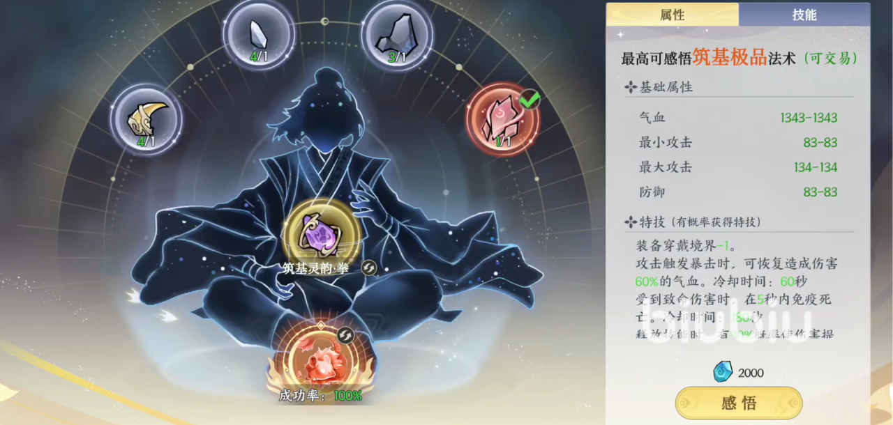 然后想要感悟这一个法术的话,那你还需要准备好四种材料。每一种法术所需要的材料都不一样,不过前期大家不要用红石头。因为这个东西特别珍贵,所以建议用一些品质更低的产量,这样就不会暴殄天物,之后再花费2000灵玉,就可以成功感悟了。