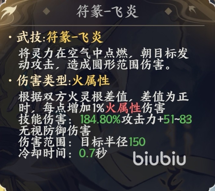 惊尘的技能体系围绕火属性的特点展开,基础技能符篆飞炎可形成一个圆形的范围伤害,具体的伤害值会根据双方火灵根的差值去变化,核心技能炙炎焚天也是范围攻击,释放时会产生剧烈爆炸,处在攻击范围内的敌人会受到高额的伤害,适合在据点争夺或副本清场时使用。惊尘的神通叫做极无尽业火正法,使用这招之后,会召唤出来无尽业火,对超大范围内的敌人施加伤害,进一步强化了角色的输出能力。