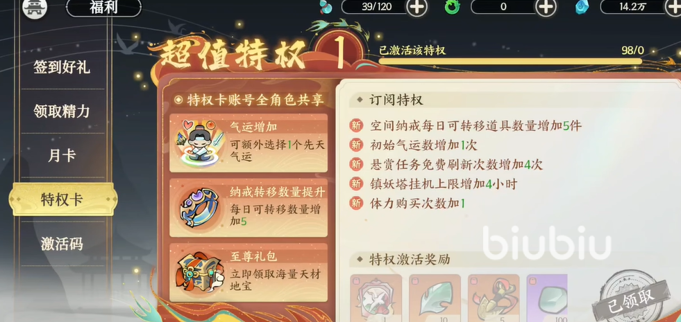 接着就是特权卡,这个卡的作用价值非常高,因为几乎给的所有加成都能有效提高玩家们的修行速度,如果氪了的话,那么后续的提升速度是高于平民玩家的,其内容包括了空间容纳增加为5,同时初始气运可以免费加1,然后就是镇妖塔的挂机增加4个小时,还可以获得额外购买体力的机会。