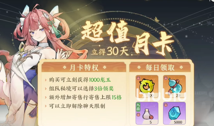 首先就是30元的月卡,这个月卡机制在多数游戏都是有的,而游戏的月卡赠送的奖励还是丰富的,会立即赠送1000的龙玉帮助玩家们快速修行,同时组队秘境获取的经验提升3倍,这样能加快角色的提升速度,然后就是寄售处的格子增加15个,可以提升玩家们的售卖数量以及容纳数量,最后就是聊天不会受到任何的限制,自由度一下就拉高了。