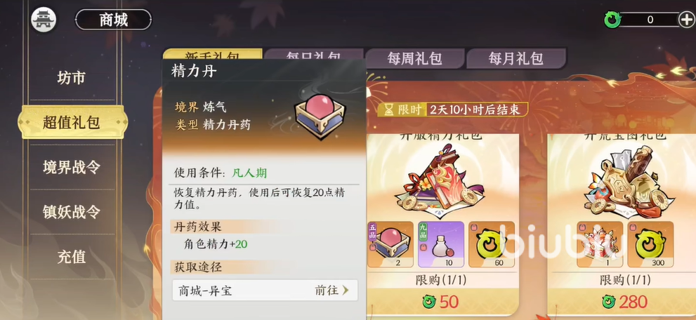 最后就是各种礼包,这些礼包包括了丹药,法宝以及各种修炼道具,这些道具都是能提升玩家们升级速度的,如果资金足够的话可以选择购买哦。