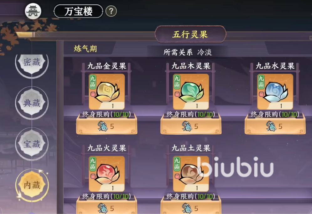 万宝楼中出售的物品很多,这里优先推荐大家购买的就是各种属性的灵果,分别是金木水火土。每一种九品灵果的限定购买次数是10,然后需要花费5枚令牌购买一个,当你将其全部购买之后。就可以大幅度提升自己的五行灵根的属性,从而加快自己的修炼速度。