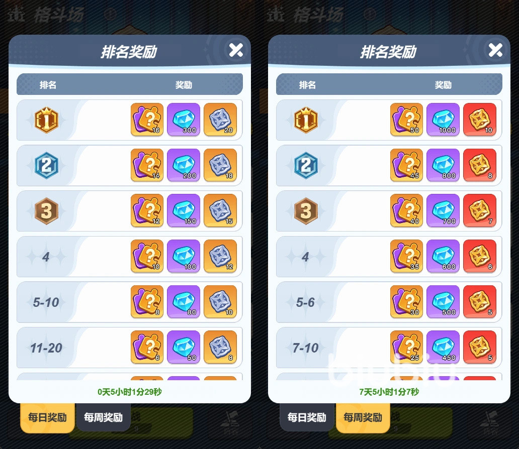 1.格斗场排名。每周日22点结算,结算奖励提供黄金勋章,这是大家升段位的关键道具,大家可以在冲结算的末尾囤入场券,然后卡时间点一波冲刺。