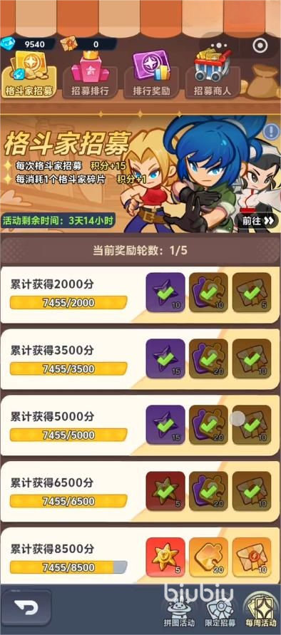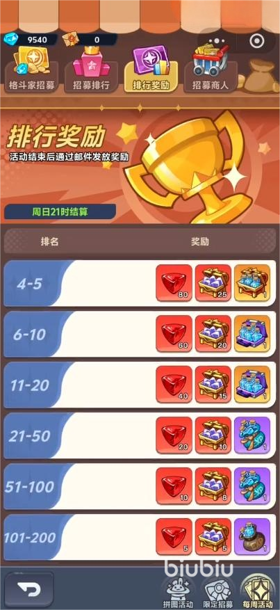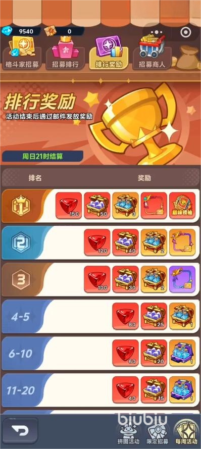 大家都知道招募界面是可以领取抽卡次数和碎片的,但是忘记了每周活动界面,在这个界面里面大家可以领取格斗家招募奖励,并且还能观看全服的大佬排行,在排行奖励里面可以看到不同排名领取的道具,100-200一般玩家都是可以领取到,虽然只是少量的石头也是固定的福利。