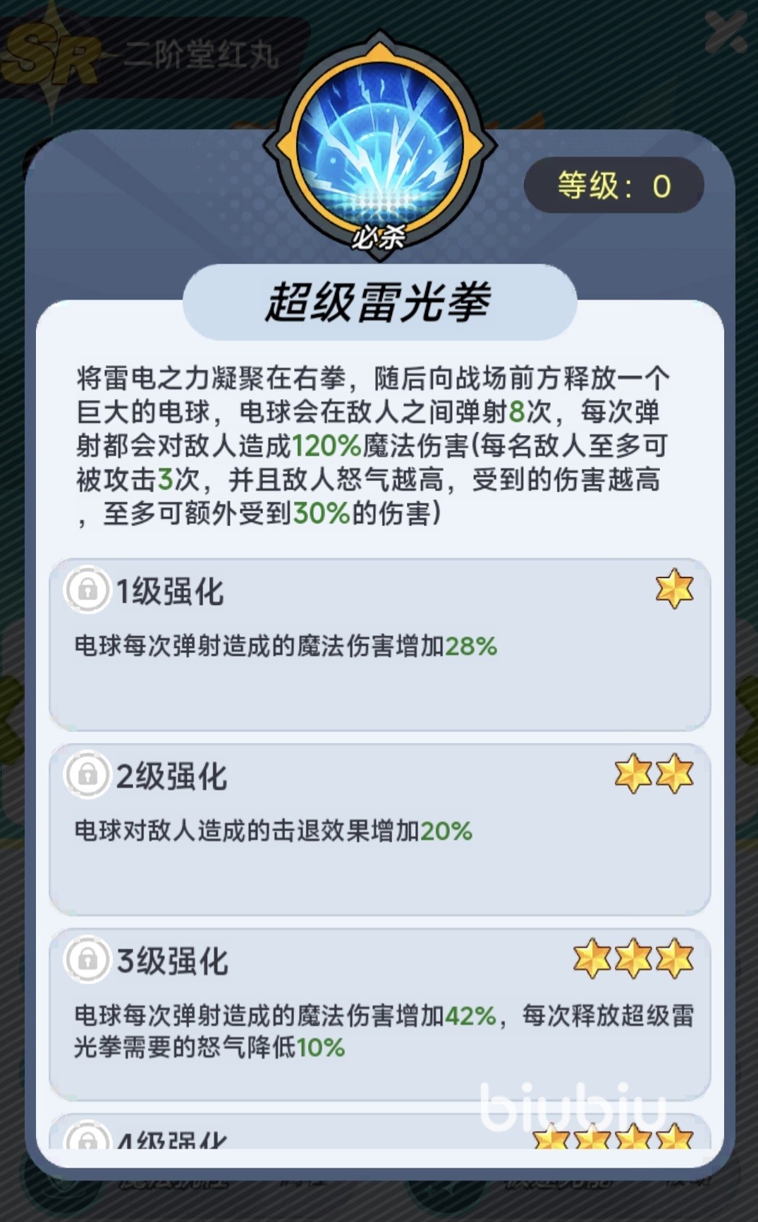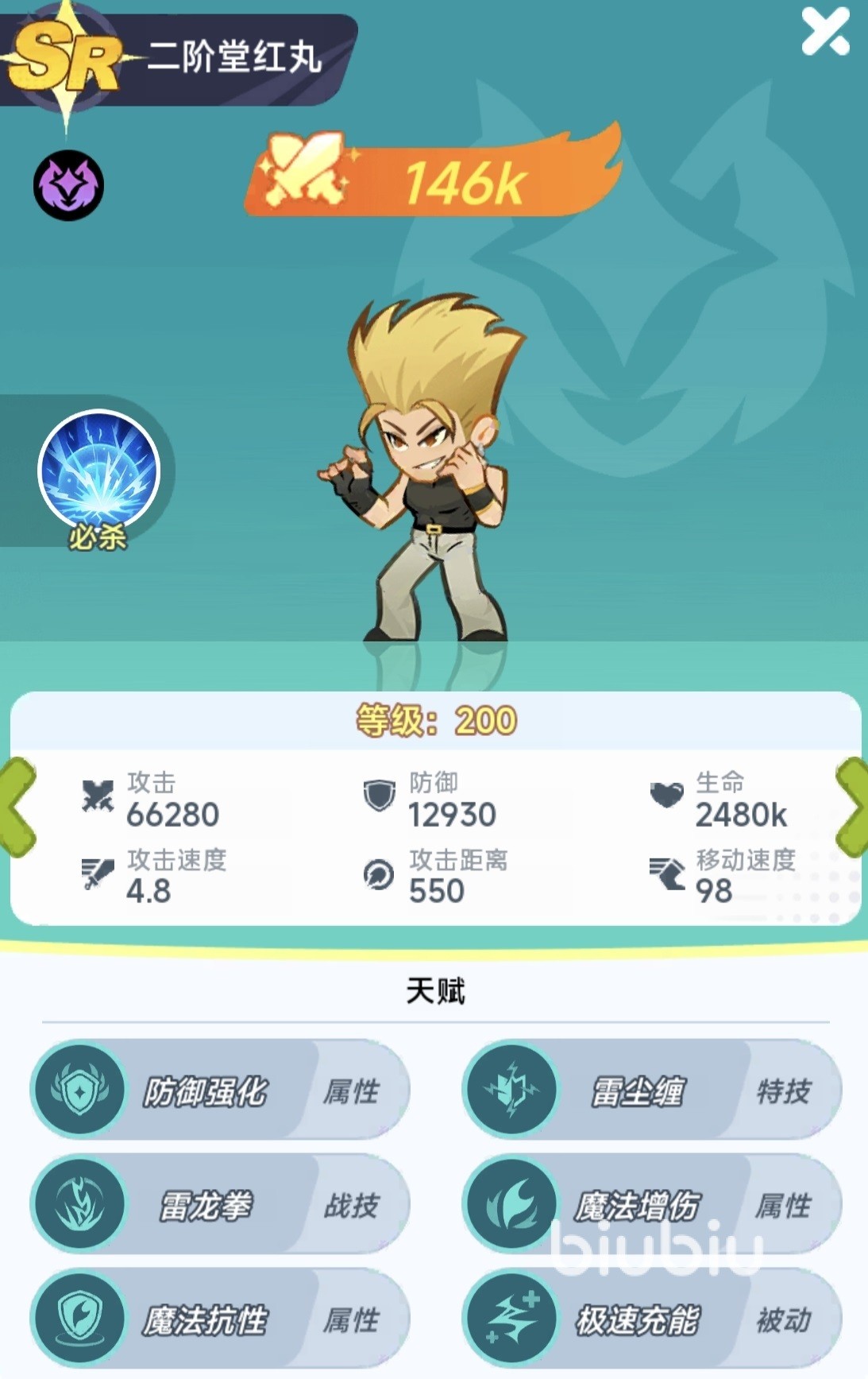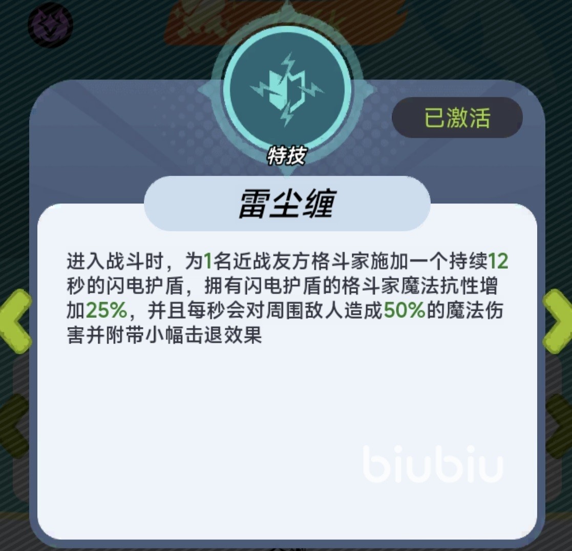 该角色的核心技能是超级雷光拳,释放出电球缓慢推进造成伤害。不仅伤害输出足,还能挤压敌方阵型,强化之后伤害提升,怒气消耗降低,同时附带眩晕效果。第二个雷龙拳,通过普攻就有几率触发,打出魔法伤害,命中后会降低对方怒气,专门克制依靠怒气的大招流。当提升到SSR之后,被动就会产生质变,开场直接给一名近战添加闪电护盾,带有该护盾的格斗家不仅可以获得魔法抗性加成,更是可以给周围敌人造成魔法伤害,并附带小幅度击退。有了该效果之后,我方前排就会变得更加犀利。