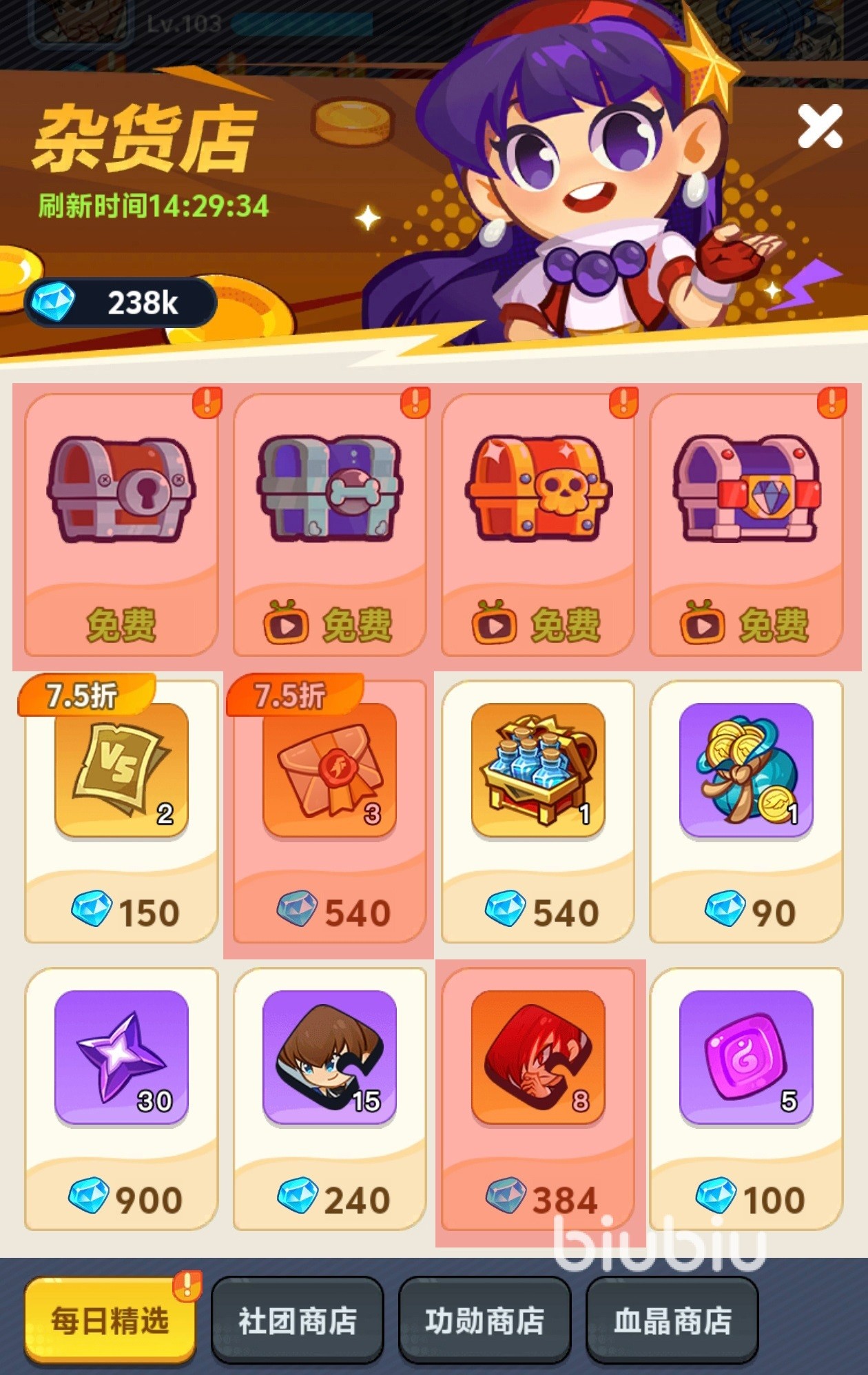 游戏中的杂货店是很多商店的集合,这里主要包括了每日精选、社团商店、功勋商店和血晶商店这四大主题商店页面,每个商店中出售的商品不同,有价值的部分也有很大区别,所以不同商店要分开进行考虑。这些大家所需要的攻略在九游都能免费提供,九游同时也是手游福利最好的APP。只需1元就能成为会员,畅享18项专属权益,可领取代金券和会员礼包,还有机会拿专属活动资格。九游还有签到抽奖活动,这样玩游戏每天领工资轻松畅玩。