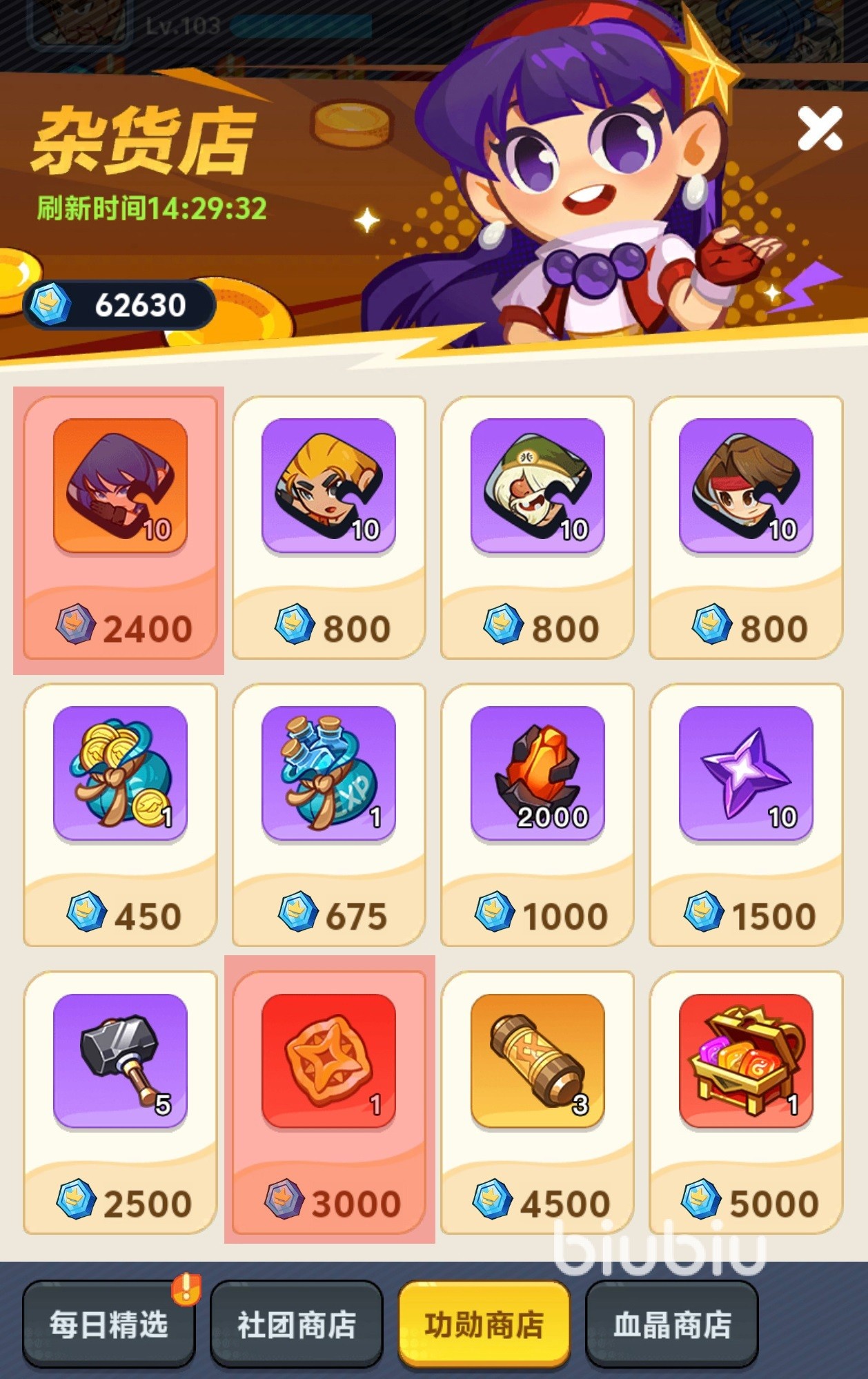 在社团商店中需要消耗的是社团币,需要参加社团中各种活动来获得。这里可购买道具是固定的,优先级最高的是黄金勋章,因为除了格斗场每周结算之外,黄金勋章并没有特别获取渠道,这里是最稳定的一个了,积累起来可进行段位提升。社团商店还出售神鹤千乐和夏尔美的碎片,如果重点培养了这两个英雄,也可以在这里购买。如果还有其他富余社团币,可购买一些进阶石等。功勋商店主要消耗的是功勋币,通过boss挑战玩法可以获得,优先级方面为黄金勋章、莉安娜的碎片和陨铁,其他随意。