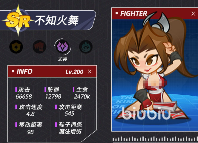 虽然不知火舞属于SR级别,但是她是法系阵营里难得一见的强价值代表,她的强度甚至可以超过许多SSR英雄。技能机制很出色,可以同时使用三把火焰扇,单体爆和群伤都非常强,清小怪速度很快。经过强化之后,不知火舞的总伤害会提高35%,从而使其成为一线输出手。不知火舞的通用性很强,既可以担任主C输出角色,也可以担任副手辅助角色来增加伤害。由于获取难度小、升星快,所以不知火舞一般能比高稀有度英雄更快地达到满星。