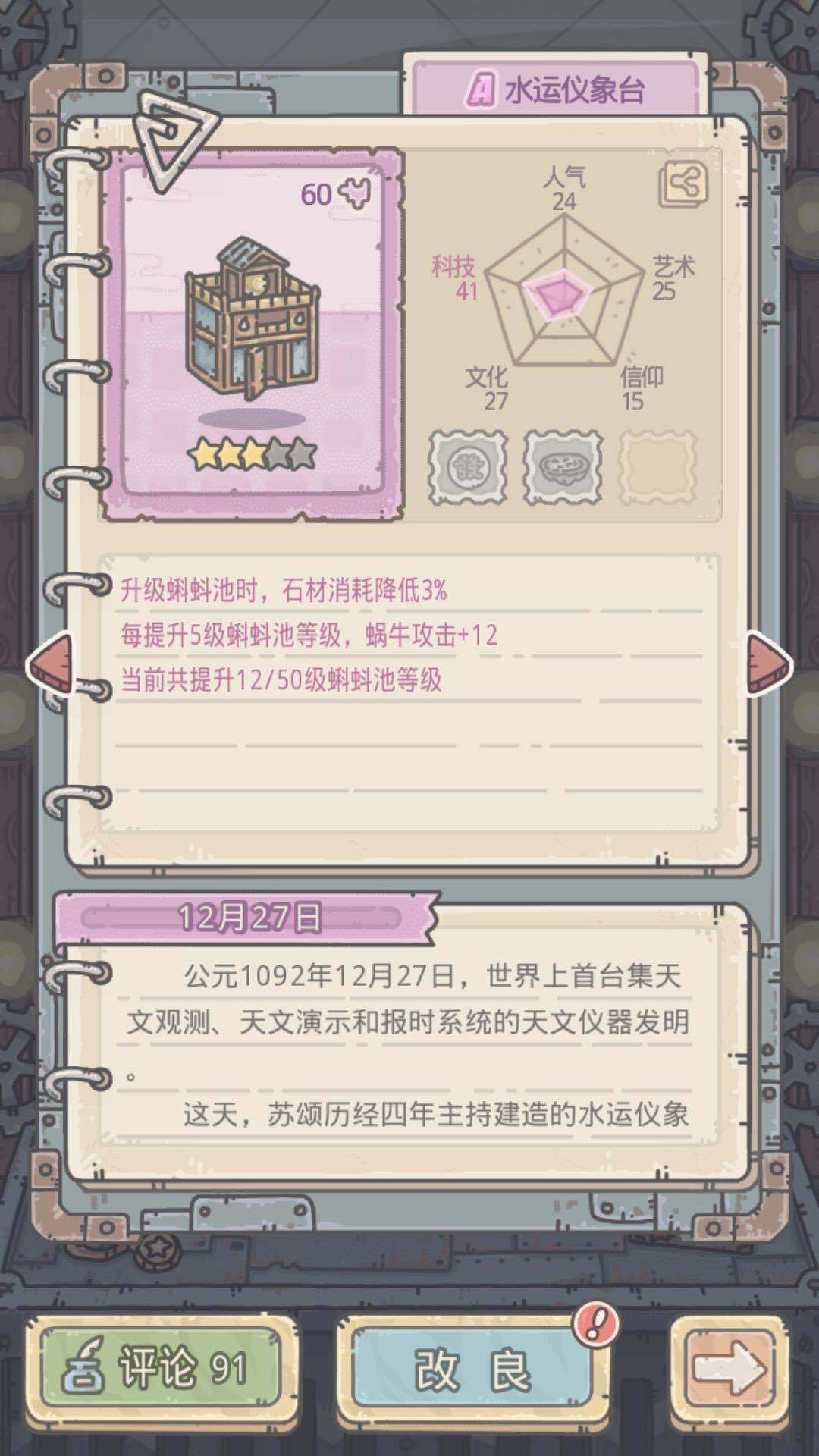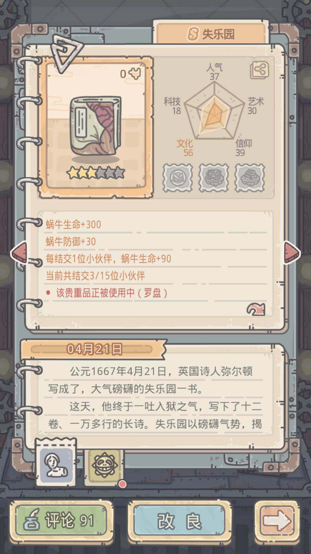 增加蜗牛本身属性的贵重物品:比如攻击力、防御力等,整个游戏无非就是围绕着蜗牛的实力进行下去的,实力越强才能解锁更多的剧情和设施,在遇到突如其来的NPC的时候也可以游刃有余,因此这类贵重物品是必须升级的。