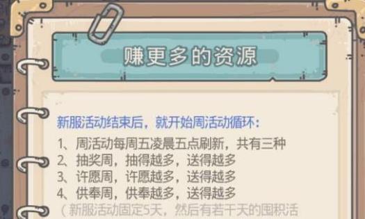 萌新期(自开启新服期五天)→囤货期→供奉期→抽奖活动期→许愿期