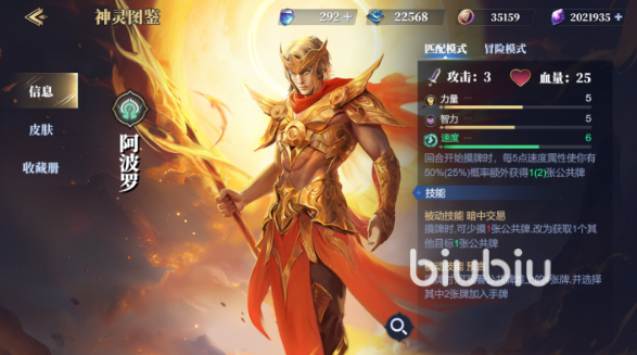 阿波罗的初始攻击力是3点,血量为25,力智速初始为5/5/6,他的被动技“暗中交易”能在摸牌的时候,少摸一张公共牌,更改成获取1个其他目标的公共牌,他的被动技“预言”会在摸牌的时候,可观看公共牌堆上的四张牌,并从中选择两张加入自己的手牌。