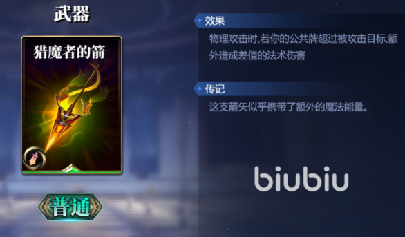 建议大家给他携带上猎魔者的箭和秩序之光,猎魔者的箭作为主要输出手段,再拉开牌差后,利用其效果对敌人额外造成牌差值的法术伤害,而秩序之光可以让其手牌上限再增加三张,进一步拉开手牌差距。