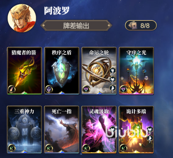 也就是说大家也可以通过这个招式来控制对方是否会被雷电劈,需要注意雷电的判定阶段是在摸牌之前,所以没有办法通过“预言”防止自己被雷电劈,整体来看,阿波罗的两个招式都能用来控制对手的手牌,大家只要在构筑卡组的时候从这方面入手,通过一个个回合的运营,就能慢慢拉开双方手牌的差距,控制住敌方的手牌,慢慢给与对手伤害,主打牌差输出。