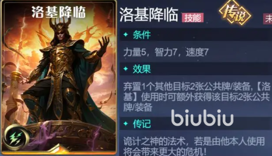 洛基虽然攻击力有限,但却有着充满欺骗的法术,他初始是2点攻击、25点力量,技能“狡诈窃取”和窃取其他对手的公共牌,提高自身的连击数同时降低对方的攻防,他的“降临”技可以帮助放弃目标2张公共牌,自己额外获得目标的2张,这些效果能让他越到后期越强,所以宝物卡方面可以选补天石,用它不断的过牌能力,来触发技能。
