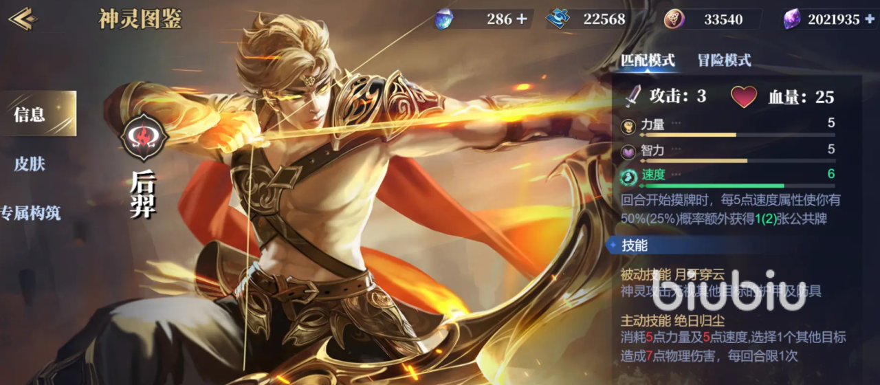 后羿初始攻击力为3,有25血量,他的被动能让自己的攻击无视目标的护甲和防具,主动技会消耗5点力量和速度,选择一位目标形成7点物理伤害,每回合限一次,这些招式让他有强大的进攻能力,唯一的缺陷在于需要消耗掉自身10点属性值才能用,所以主动技建议用来作为斩杀的手段,大家可以为其装备上射日弓和力量之剑,射日弓能在每回合首次连击时,对目标额外形成3点物理伤害,力量之剑则是每次攻击提升自己的2点力量属性。