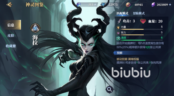 海拉初始攻击为3点,血量为20,她的技能“黑暗祝福”能在每次摸牌的时候,多获得1张公共牌和1张构筑牌,也就是说能在每次出击时比对手多摸两张牌,配合上速度觉醒能得到大量手牌,不过因为海拉的身板比较脆,只有20点的血量,这使得其只适合快速战斗,如果没有短时间内把对手打败,开始长久消耗的话,很容易就因为续航不足而失败;