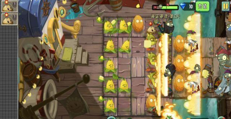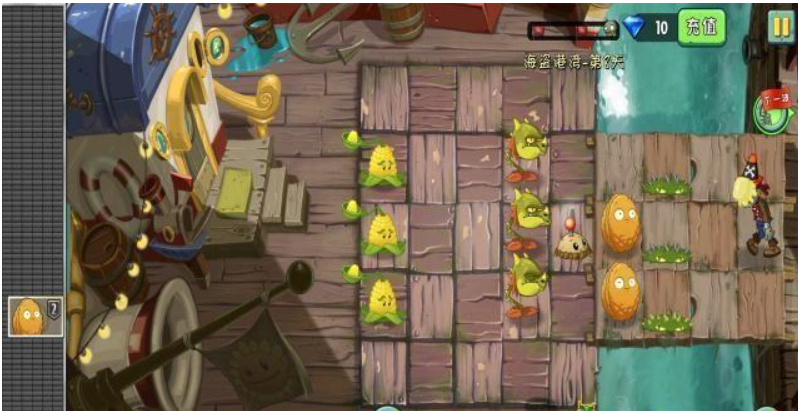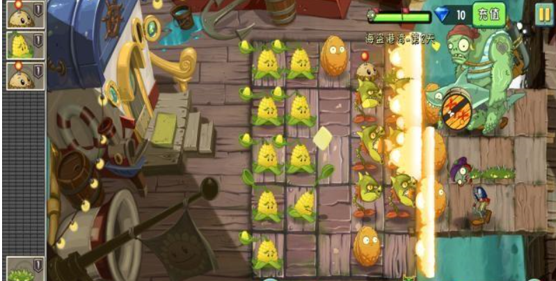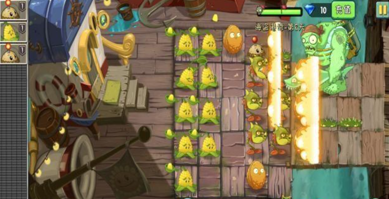 在一大波僵尸击败以后,海盗巨人僵尸就会呈现了,他一旦出现,会直接砸扁了咱们最前面s的坚果墙,由于传送带上也有坚果,所以玩家必须立刻再栽培一堵坚果墙出来,玉米投手也在一直地攻击巨人僵尸,此时玩家可以直接使用火龙草的绿豆力量,虽然火龙草的1个大招不会直接击杀掉巨人僵尸,这也说明巨人僵尸的防御果真很高,接着的用剩下的玉米投手和火龙草进攻大概二十多秒,便可以打掉海盗巨人僵尸,玩家此时也就成功地经过该关卡。