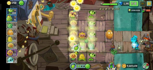 在其它三排也要快速设防,并且是尽可能攻击伤害越高的越好,损耗的太阳数目要在200或200以内。这样在早期,咱们可以快速解决过来僵尸的攻击,除此之外,还有一个要求是在两拨僵尸的时间内生产出3250的太阳数目,因此咱们要高阶的向日葵,如此在早期,咱们对太阳的分配就看起来相对局促,要确保再稳定的防御力的情况下,种上高阶的向日葵,这样就可以保卫和生产太阳同时进行了。