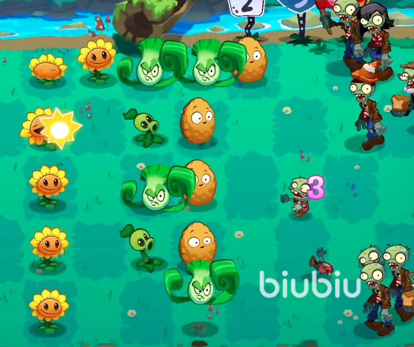 鉴于第一条路的敌人基本上都是成群出现,所以建议在最后放置一个包菜投手,这样在对付敌人的事后将会更有效果。前面我们主要所需要做的就是在每一条水路都用上莲叶,因为本关没有坚果,在水上提前阻拦敌人是非重要的,这一关每一条路线都需要至少保证有一个冰冻豌豆和一个包菜投手。莲叶尽量将其给在水面上放满。陆地在后期可以在前排或者中间位置放上倭瓜。这个在防御或者对付单个的敌人都有着奇效。按照这个打法是可以顺利通过的。