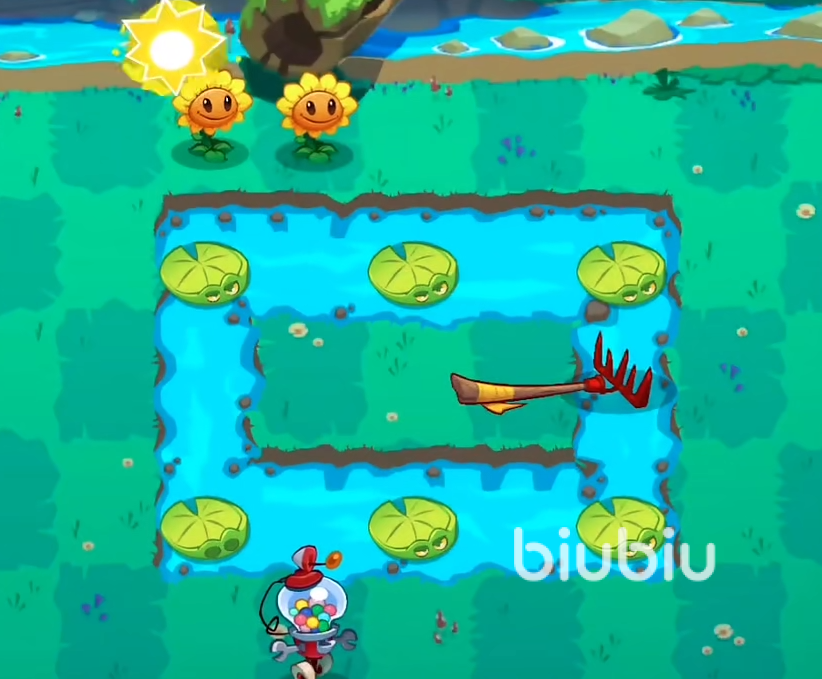本关中间有一个环形的水池。上下一开始会各给3个莲叶。一开始首先在上方放置向日葵。本关我们的阳光数量也不多。刚开始需要以种植向日葵为主。在满足阳光要求后在最下方种植一个坚果,然后在中间的最后面放一个竹子迫击炮。接下来在莲叶的最前方放置坚果。这样可以为我们争取到不少时间。之后每一行的最后面放置竹子迫击炮,前方放置坚果,中间可以放迫击炮或者豌豆射手,基本上可以平稳渡过这一关。