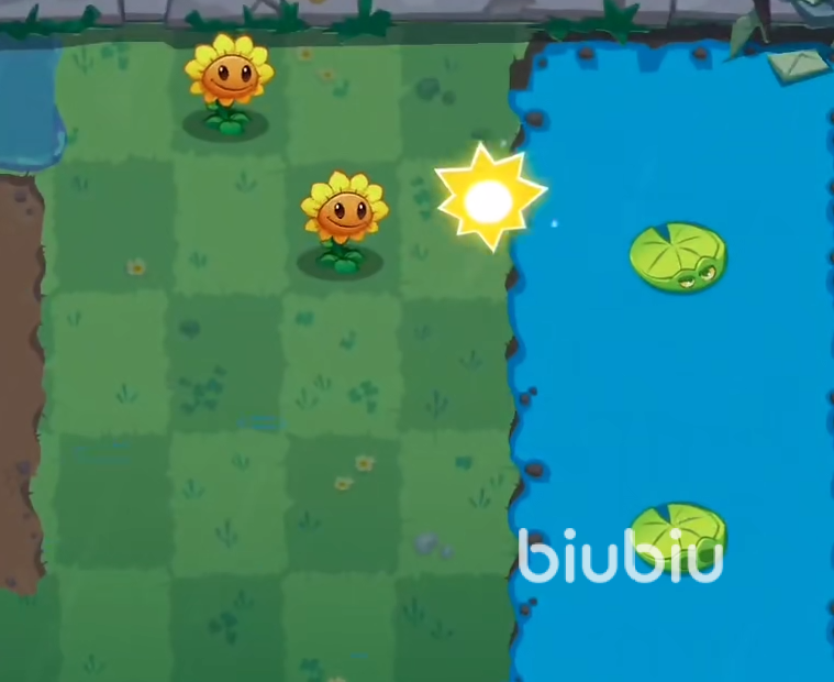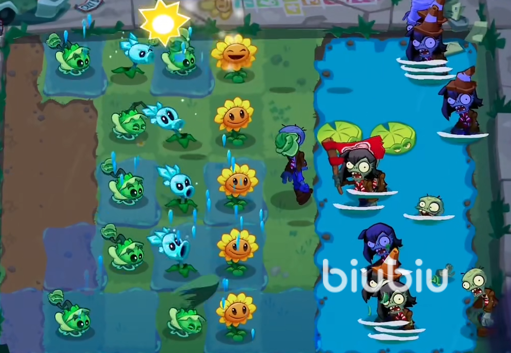 这个是属于中后期的关卡了。此关是有着较小的池塘,这点需要玩家们小心一点才行。一开始玩家们需要先种植两个向日葵来收集阳光,这一关我们的阳光在前期是非常少的。所以需要多收集一些阳光才行。关卡初期有赠送我们两个莲叶,但是一开始的僵尸都不会从那两处莲叶过来。前面我们至少拥有3个以上的阳光才行,然后在池子中间的位置放置一个莲叶来进行阻挡。在莲叶的后面建议放上一个冰冻豌豆。这样可以有效的对付这条路上的敌人。接下来第一条路的水池需要放置一个莲叶。