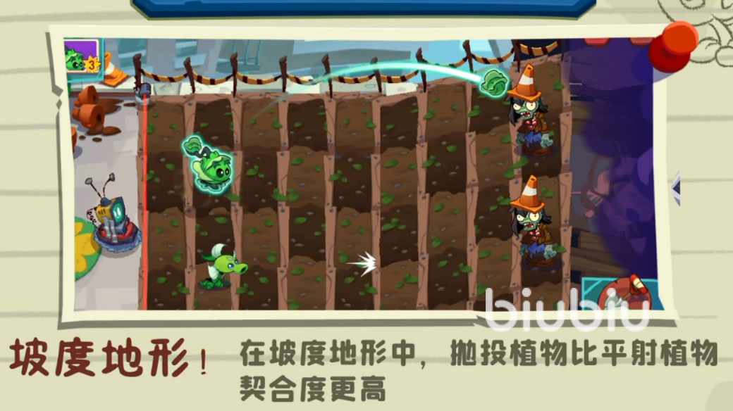 成功过关之后就可以获得卷心菜投手,之后即可开始第三关。这时地形也发生了改变,变成了坡度地形,投手植物能打到斜坡上的僵尸,所以一定要将投手植物放在后排。面对平衡车小鬼僵尸,这时建议用荔枝将其拦下来,不然很容易冲在前面。