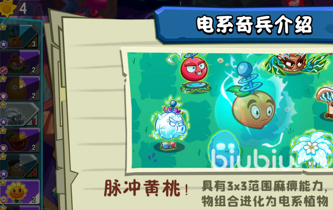在攻打之前,大家可以先准备好一些有用的植物。第一个推荐大家用脉冲黄桃,用了它就可以让一些植物进化成为电系,这样就可以具备麻痹能力。因为在这个关卡的地图顶端会出现三个电磁发射装置,会对非电系植物造成麻痹以及额外伤害,所以大家就一定要带电系植物。