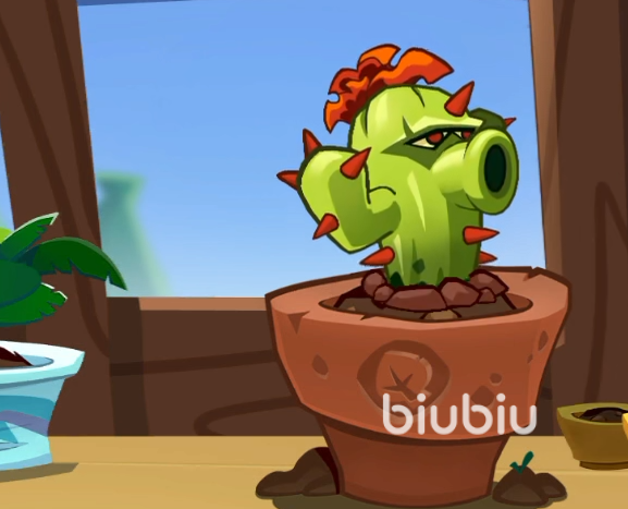 这个植物在前作便有出现过,从本作来看仙人掌变得帅气了一些。它是一个远程攻击的单位,本身的生命值是300点,攻击力是50点。总体来说攻击力就不低。它的种植冷却时间比较短,阳光消耗为4,不算多也不算少。它的攻击方式是向右边发射1发尖刺。对命中的每个敌人都会造成100%的攻击力。它的技能是可以进行穿刺攻击的,在技能开启期间的贯穿攻击伤害不低,非常适合对于一条路线上出现的大群的敌人。总体来说仙人掌在对付敌人比较多且集中的关卡里是非常好用的。