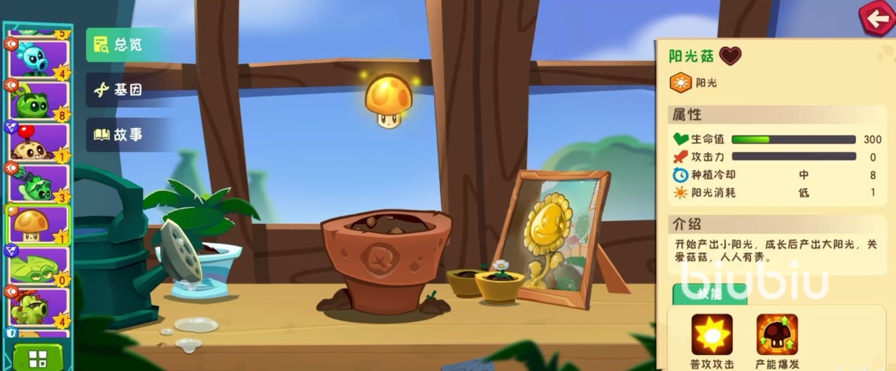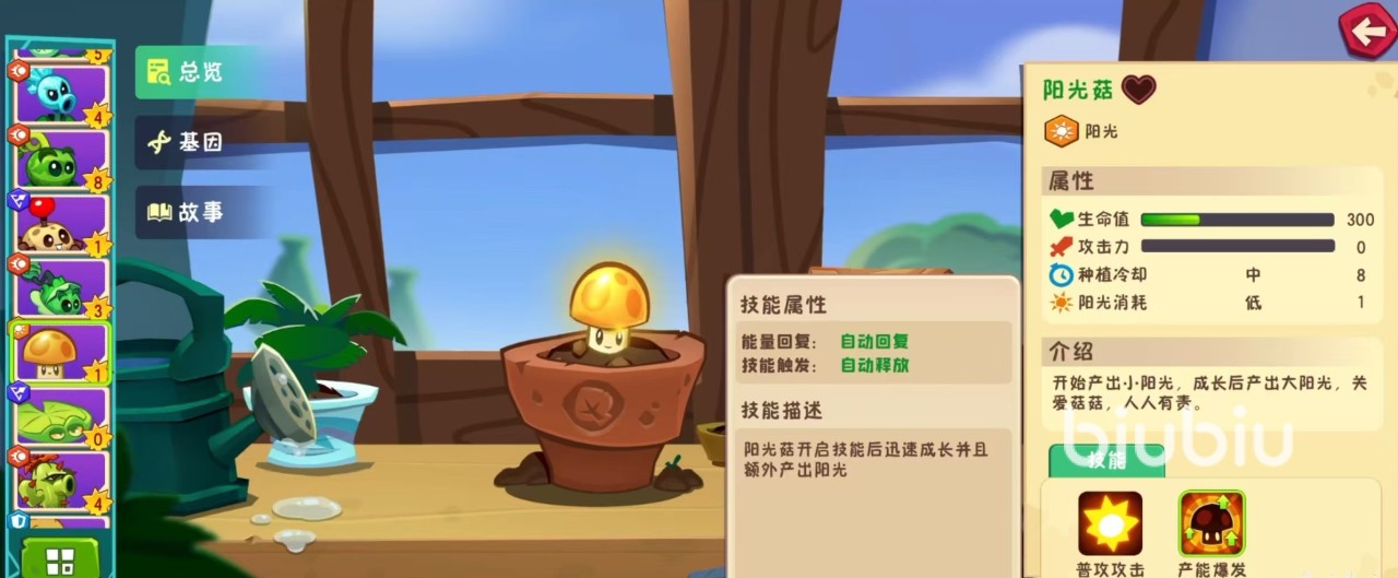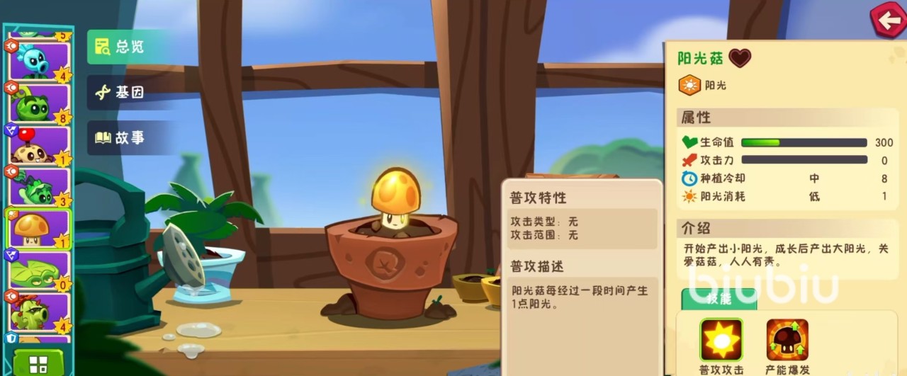 阳光菇是属于阳光类型的植物,在属性方面,生命值300,不具有攻击力,种植冷却时间中等,阳光消耗低,只需要1点阳光就可以种植下去。作为阳光植物,它的作用当然是产出小阳光,成长之后可产出大阳光,是非常重要的基础植物类型。主要技能有两个,分别是普通攻击和产能爆发。