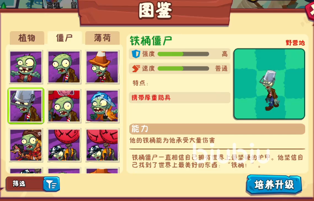 这是强度偏高的僵尸,速度中等,头上顶着铁桶,正是这个铁桶,让他能承受巨大的伤害,它一直相信自己拥有世界上最坚硬的护甲,铁桶就是他觉得找到世界上最美好的东西。