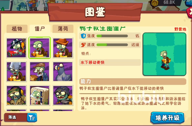 行动非常迟缓的僵尸,身上带着个鸭子的游泳圈,但是它比普通的僵尸在水下的移动速度更快,其实它不会游泳,但是游泳圈给了他下水的勇气。升级版为“鸭子救生圈路障僵尸”,比普通版本更加强壮,携带防具的它在水下移动很快,承伤能力更强。
