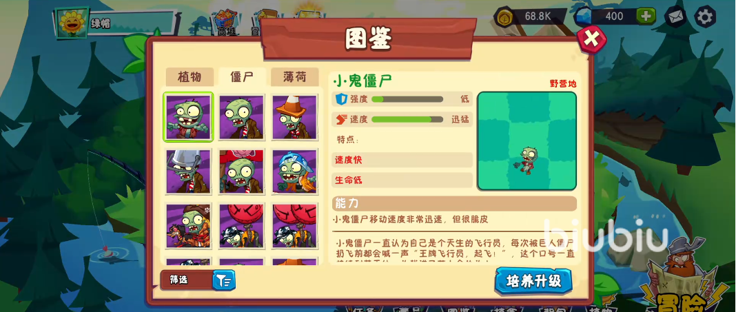 虽然这个的强度比较低,但是其速度则是很快的,它的能力比较特殊,浮空的气球带着他可以直接飞过植物,普通的防守都无法抵御他的飞跃,无法对其造成伤害,但是它惧怕风吹。它还有个进阶版,“抗风气球僵尸”,它的身上有两个气球,这个版本的它就不惧怕风吹了。