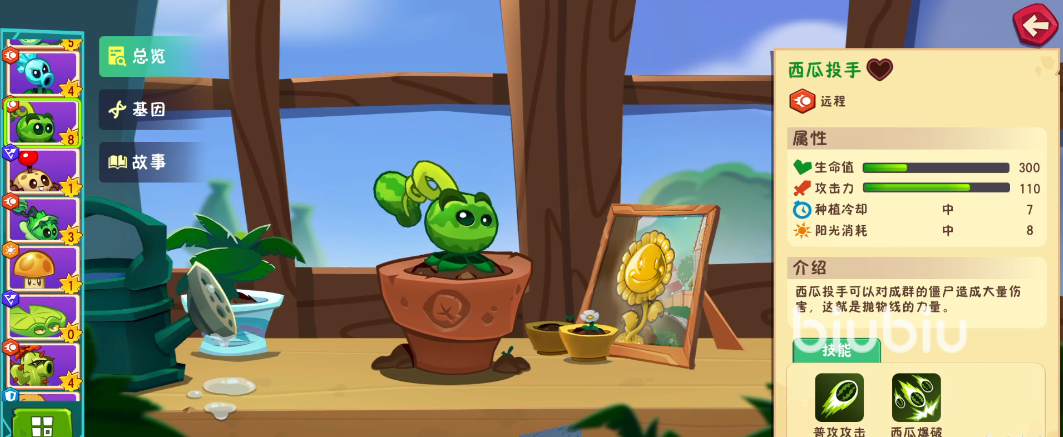 也是远程植物,攻击力超强,基础攻击就达到了110。普攻会对右侧一行距离较近的僵尸投掷西瓜,击中后对3X3范围内全部敌人造成自身攻击力50%伤害。小技能“西瓜爆破”,它的下次攻击会向全场最近的敌方目标投掷出4个西瓜,对技能范围内全体敌方目标造成233%攻击力损伤。能对群体进攻,且攻击力强悍。