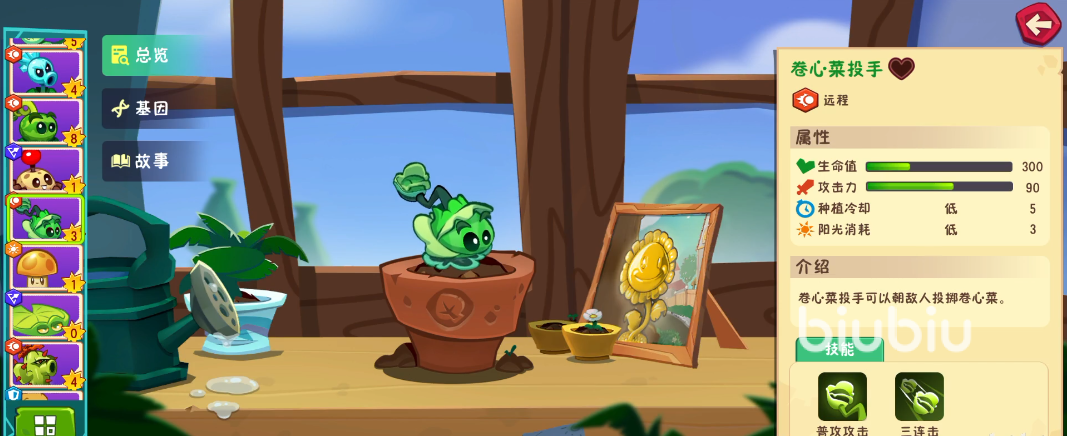 能对距离最近的单位投掷卷心菜,对1个敌方造成100%攻击。“三连击”的技能会让下次攻击,向全屏内距离最近的3个僵尸投射卷心菜,并对它们造成133%攻击力损伤。