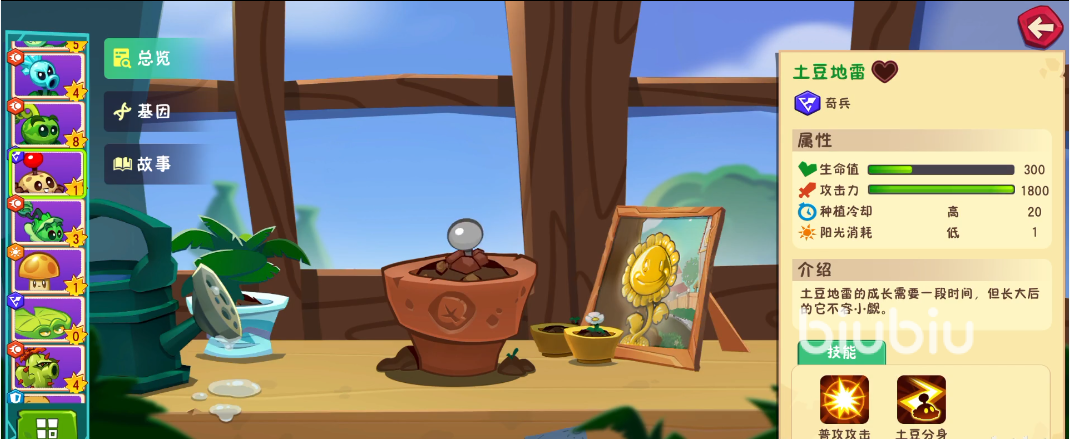 攻击力达到了1800的奇兵。将它种下去之后,需要等待一段时间成长,成型后才会出现在地面,与僵尸接触后会立刻自爆,对1格内全部敌方造成50%伤害。拥有技能“土豆分身”,它的技能使用后会随机在场上生成2个土豆地雷。虽然是一次性的,但是杀伤力十足。