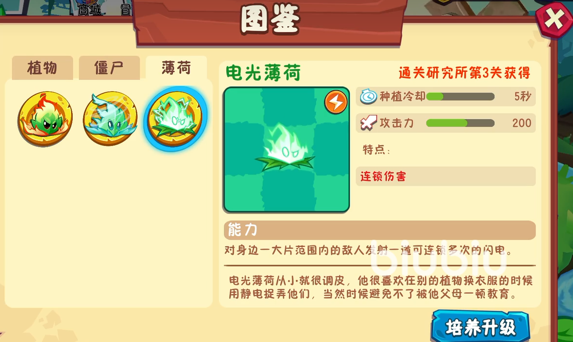 电光薄荷在我们通关研究所第3关的时候能获得,它从小就非常调皮,会用静电来捉弄其他的植物,它的攻击力为200,冷却是5秒,能力是对身边一大片范围内的敌人发射一道可以连锁多次的闪电,对僵尸们造成连锁性的损伤,适合应对大批量的敌人。
