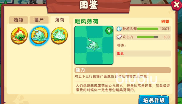 飓风薄荷在初始就有经常被人说口气很大,但它在战斗中却有着不错的击退作用,它的攻击力是500,种植冷却为100秒,能力是对上下三行的僵尸都造成伤害,并且还会附带上击退效果,减缓敌人前进的脚步,为植物创造输出机会。