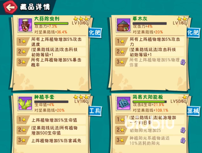 在实际对战过程中,建议装备3星种植手套和2星及以上松土助手,这两个分别能提高上阵植物生命值和治疗量,在配备简易太阳能板藏品,它能在初始时增加一个向日葵,草木灰和大蒜除虫剂可以带1个也可以全带,在星级上能达成2星最好,它们可以用来增加植物的攻击能力。这样的配置在上阵植物的生命值、防御能力、攻击能力和坚果防线上都有所提提升,基本上能沿用到游戏的中后期,待后续玩家获得橙色藏品后可以替换掉同类型的藏品。