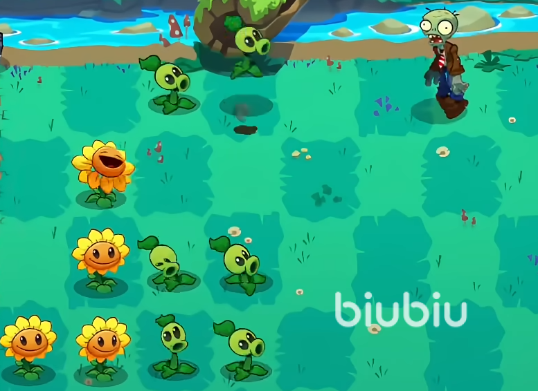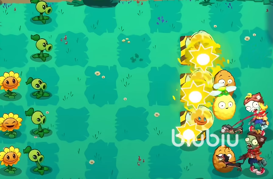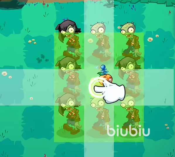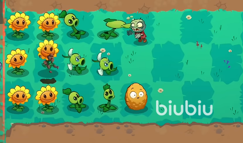 一开始我们需要在后面一排种植向日葵来收集阳光,之后除了最后一排以外都需要种上豌豆射手,其中尤其是第二行的敌人出现的是格外多,所以建议在前方的位置放置坚果,然后在第二行中间的位置来放置一个吹风草,这样咱们承受的压力会小上不少。等到压力缓解了再去最后一行种植一下豌豆射手。这一关敌人一多便要使用黄桃来将敌人眩晕来缓解压力。