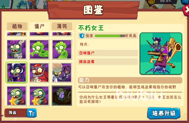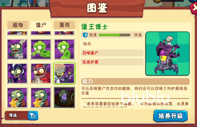 它的强度非常高,能力也不像其他僵尸一样是单一的,不仅能召唤其他僵尸攻击玩家种植的植物,还可生成迷雾,阻挡植物和小伙伴们的视野,攻击力强大且具有较强干扰能力。