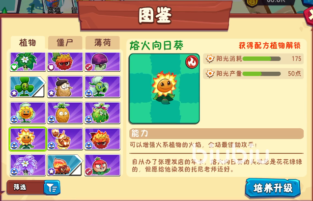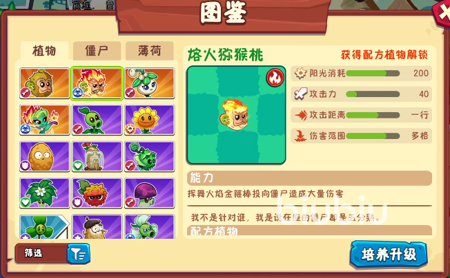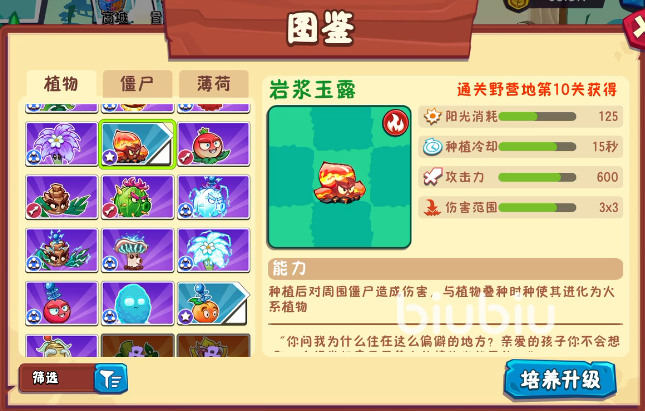 这个植物在通关野营地第10关可获得,自身攻击力有超高的600,种植下去后能对周围敌方造成高额伤害,它还拥有个实用性和适用性都非常高的能力,那就是能和各种植物进行叠种,这让与其叠种的植物就能进化为火系植物,比如上述的卷心菜,还有很多其他植物都可与之叠种得到进化效果。