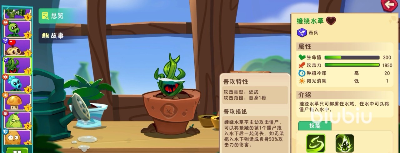 推荐二:缠绕水草,可命中同一航道内前后两个目标,尤其是要到水面地图作战时,可以优先带它,值得注意的是它必须栽在浮水叶上。