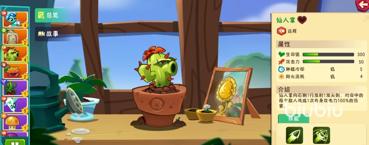 先来看一下仙人掌这个金卡植物的基础属性,生命值300点,攻击力50点,种植冷却时间低,阳光消耗低。仙人掌可以向右侧一行发射尖刺,命中每个敌人后,都能造成100%自身攻击力的伤害。在攻击方式方面有两种,分别是普通攻击和贯穿子弹。普通攻击的类型是平射,攻击范围一行,能发射出尖刺攻击僵尸。