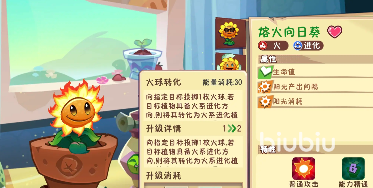 它的“火球转化”能向着指定目标投掷1枚火球,若目标带有火系进化的方向,就将其转化成火系进化植物,它的“星火燎原”会向前方放出一道火焰波,为改行所有的火系植物附加上1层燃烧加成,该加成每层会提升5%的攻击速度,最多可以叠加3层。