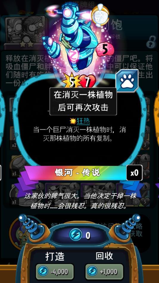 狂热技能在基础能力上是不会为单位带来任何加成的,但是当单位在消灭了一株植物之后,就可以额外的获得一次攻击机会。这次攻击机会在伤害量上和单位属性一致,但是在目标的选择上会以生命值较低的一个植物为目标。所以战斗中经常出现狂热单位进行收割的情况,这就是该技能的强大之处。