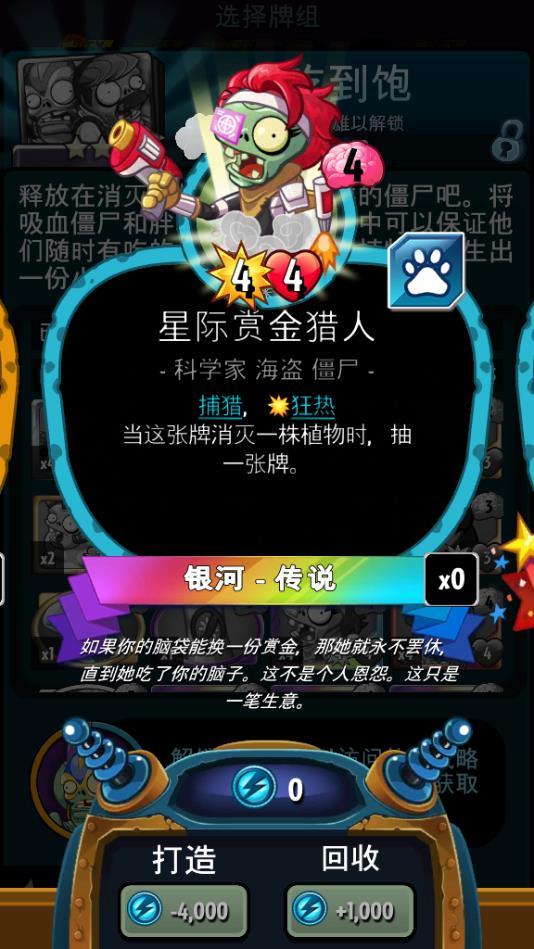 第二个要介绍的是星际赏金猎人这个僵尸,在能力上除了狂热的技能之外,该单位还带有追捕的技能。在打出植物卡牌的时候,该单位可以获得一次移动的机会。除此次之外,战斗中每消灭一株植物,该单位就可以进行一次抽卡。这个技能可以较好的帮助玩家获得大量卡牌在手,从而在后续的战斗中取得不错的战斗优势。