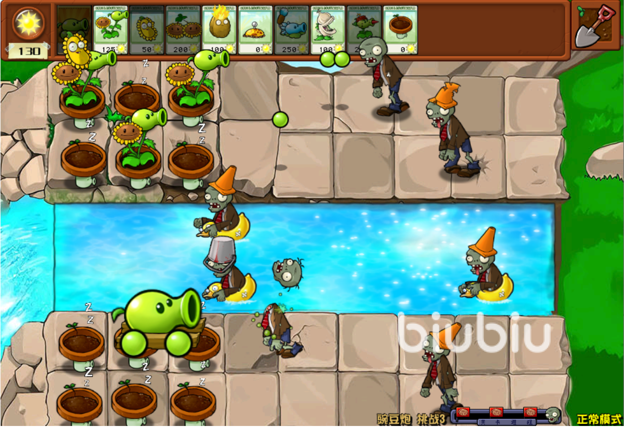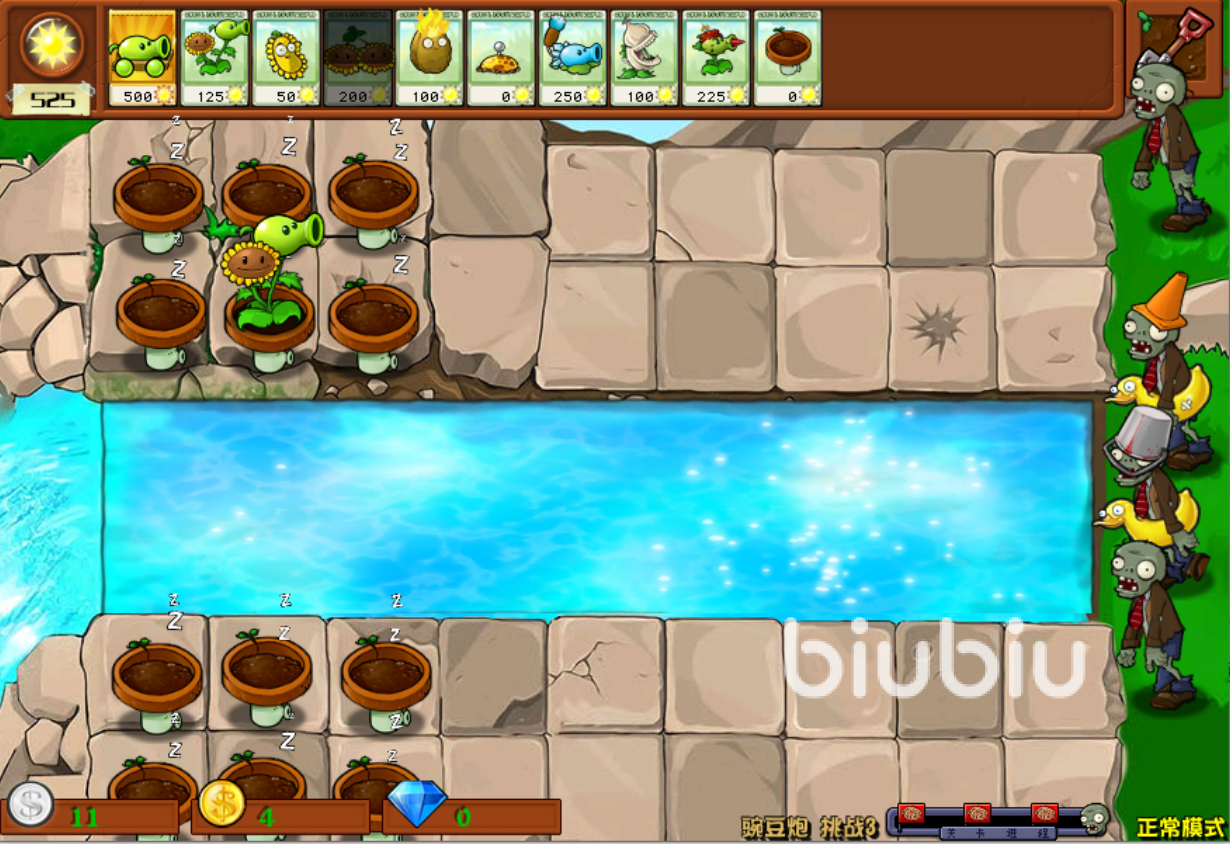 1、主要就是前期种向日葵来稳定发育,同时水路豌豆香蒲配合蓝火炬过渡前期,基本上还是会比较稳的。