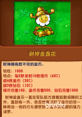 其中银币的伤害力为100点,金币的伤害力高达500点,而钻石更是能造成惊人的1000点伤害。这样的攻击能力,足以让任何僵尸都望而生畏。同时财神金盏花的韧性也非常高,达到了1000点。这意味着它非常耐打,能够在战场上持续为玩家提供火力支援。而且,它的攻击范围是全屏的,无论玩家的僵尸从哪个方向来袭,它都能轻松应对。种植财神金盏花只需要888点阳光,这在游戏中并不算太高。而且它的冷却速度也还可以,让玩家能够更快地再次种植它。这样的特点使得财神金盏花成为了一位非常实用的植物,无论是在防御还是攻击方面都有着出色的表现。
