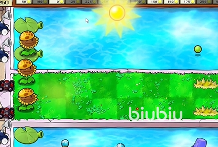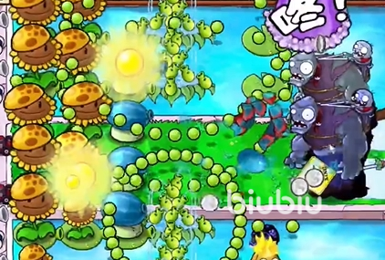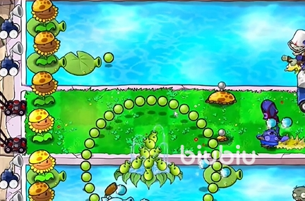 等阳光攒够了,在泳池下方种个豌豆许愿池,这个植物能随机发射出各种豌豆类植物子弹,是个多面手。右侧草坪上再来两个土豆雷,它们小心隐藏在下面,等僵尸走近了就会“砰”的一声爆炸,给僵尸来个措手不及。接下来上方泳池里再添点许愿池和寒冰,火力和减速效果瞬间具备。中间草坪上种个西瓜和大蘑菇,这个植物能发射冰冻西瓜,对一群僵尸造成范围伤害,并且还能让它们减速,简直是群战利器。