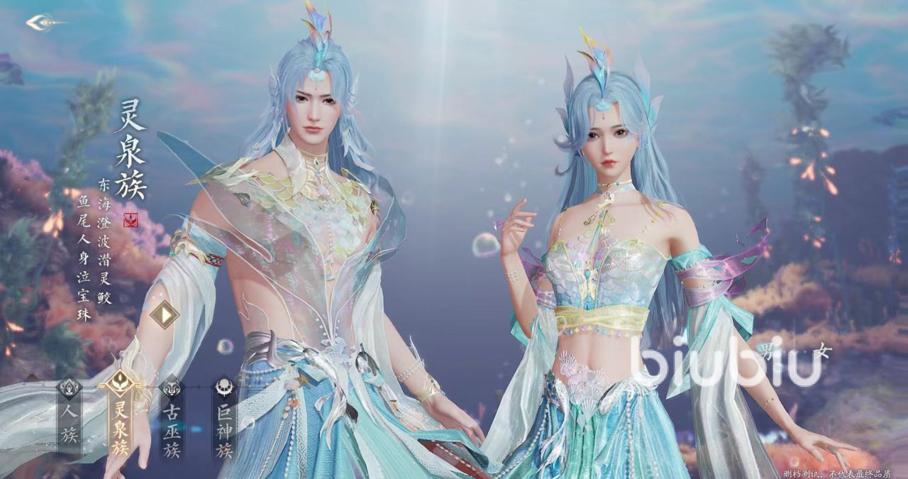 先来从外形方面做一下区别,人族属于女娲后人,身材匀称,知天理,日常装扮以儒雅的长裙和长衫为主,在解控的时候拥有独特的仙鹤以及山河特效。相比于其他种族,其实小编并不推荐大家选择人族,首先是外观并没有出彩的地方,也没有明显的优势,各个方面非常均衡,也可以说是平庸。灵泉族属于龙族的后裔,精通音律,有鱼和人两种不同的形态,在陆地上的时候为人形,进入海中就可以幻化出鱼身。外形方面也很有鱼类特征,拥有长水蓝色长发,解控的时候是一尾水形成的鱼,非常通透。外观方面最好看的应该就属灵族,尤其是选择灵族的女性角色,更是将自身特点展现了淋漓尽致。